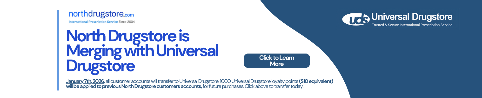1,000 Universal Drugstore Loyalty Points ($10 value) automatically added to your new Universal Drugstore account when you merge. Use them on your very first order to save even more.
